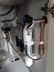 In de eerste stap wordt alles wat via de waterleiding in het water terecht kan komen verwijderd. Denk b.v. aan modder, lood, bezinksel, roest. Dit gebeurt met een zogeheten koolstoffilter.